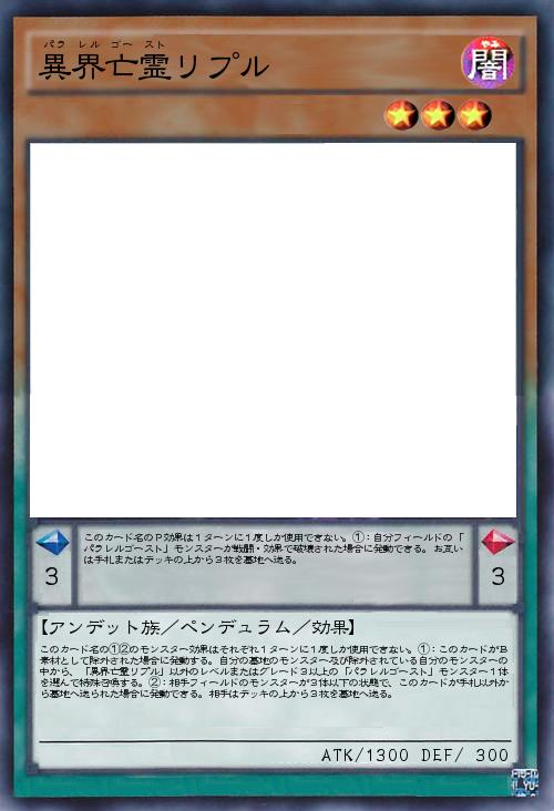 | このカード名の①②のモンスター効果はそれぞれ1ターンに1度しか使用できない。①:このカードがB素材として除外された場合に発動する。自分の墓地のモンスター及び除外されている自分のモンスターの中から、「異界亡霊リプル」以外のレベルまたはグレード3以上の「パラレルゴースト」モンスター1体を選んで特殊召喚する。②:相手フィールドのモンスターが3体以下の状態で、このカードが手札以外から墓地へ送られた場合に発動できる。相手はデッキの上から3枚を墓地へ送る。 | |||