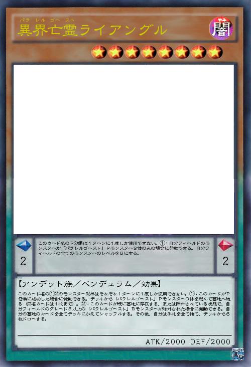 | このカード名のP効果は1ターンに1度しか使用できない。①:自分フィールドのモンスターが「パラレルゴースト」Pモンスター3体のみの場合に発動できる。自分フィールドの全てのモンスターのレベルを5にする。 | |||