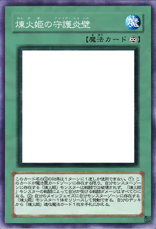 | このカード名の②の効果は1ターンに1度しか使用できない。①:このカードが魔法罠カードゾーンに存在する限り、自分モンスターゾーンに存在する「煉火姫」モンスターは戦闘では破壊されず、「煉火姫」モンスターの戦闘によって自分が受ける戦闘ダメージはすべて0になる。②:自分のメインフェイズに自分モンスターゾーンに存在する「煉火姫」モンスター1体をリリースして発動できる。自分のデッキから「煉火姫」速攻魔法カード1枚を手札に加える。 | |||