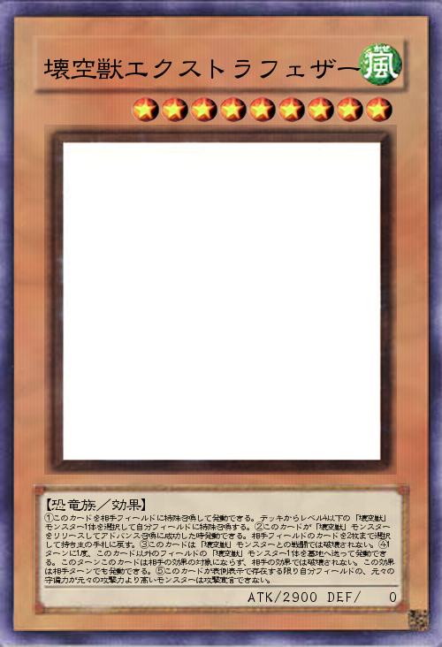 | ①このカードを相手フィールドに特殊召喚して発動できる。デッキからレベル4以下の「壊空獣」モンスター1体を選択して自分フィールドに特殊召喚する。②このカードが「壊空獣」モンスターをリリースしてアドバンス召喚に成功した時発動できる。相手フィールドのカードを2枚まで選択して持ち主の手札に戻す。③このカードは「壊空獣」モンスターとの戦闘では破壊されない。④1ターンに1度、このカード以外のフィールドの「壊空獣」モンスター1体を墓地へ送って発動できる。このターンこのカードは相手の効果の対象にならず、相手の効果では破壊されない。この効果は相手ターンでも発動できる。⑤このカードが表側表示で存在する限り自分フィールドの、元々の守備力が元々の攻撃力より高いモンスターは攻撃宣言できない。 | |||