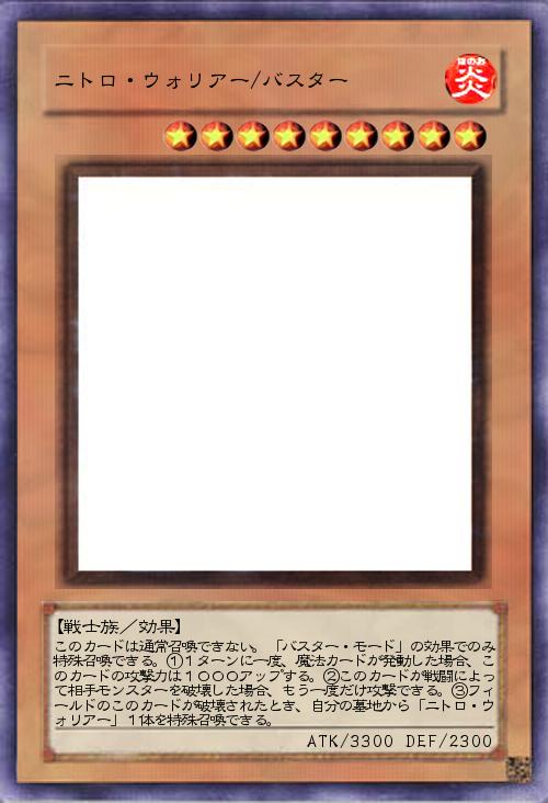| このカードは通常召喚できない。「バスター・モード」の効果でのみ特殊召喚できる。①1ターンに一度、魔法カードが発動した場合、このカードの攻撃力は1000アップする。②このカードが戦闘によって相手モンスターを破壊した場合、もう一度だけ攻撃できる。③フィールドのこのカードが破壊されたとき、自分の墓地から「ニトロ・ウォリアー」1体を特殊召喚できる。 | |||