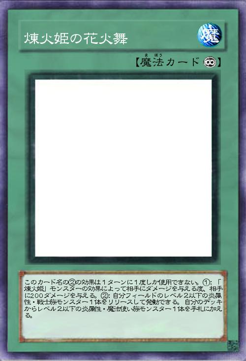 | このカード名の②の効果は1ターンに1度しか使用できない。①:「煉火姫」モンスターの効果によって相手にダメージを与える度、相手に200ダメージを与える。②:自分フィールドのレベル2以下の炎属性・戦士族モンスター1体をリリースして発動できる。自分のデッキからレベル2以下の炎属性・魔法使い族モンスター1体を手札に加える。 | |||
