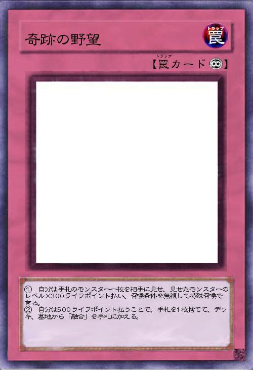| ① 自分は手札のモンスター一枚を相手に見せ、見せたモンスターのレベル×300ライフポイント払い、召喚条件を無視して特殊召喚できる。 ② 自分は500ライフポイント払うことで、手札を1枚捨てて、デッキ、墓地から「融合」を手札に加える。 | |||