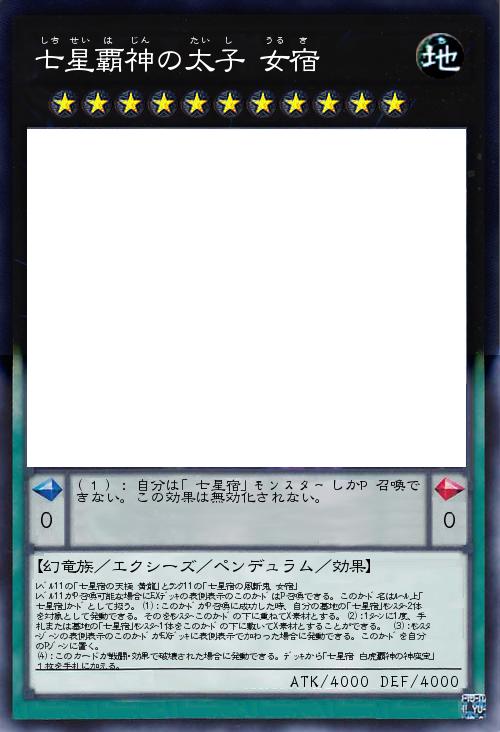 | レベル11の「七星宿の天極 黄龍」とランク11の「七星宿の風斬鬼 女宿」 レベル11がP召喚可能な場合にEXデッキの表側表示のこのカードはP召喚できる。このカード名はルール上「七星宿」カードとして扱う。(1):このカードがP召喚に成功した時、自分の墓地の「七星宿」モンスター2体を対象として発動できる。そのをモンスターこのカードの下に重ねてX素材とする。(2):1ターンに1度、手札または墓地の「七星宿」モンスター1体をこのカードの下に敷いてX素材とすることができる。 (3):モンスターゾーンの表側表示のこのカードがEXデッキに表側表示で加わった場合に発動できる。このカードを自分のPゾーンに置く。 (4):このカードが戦闘・効果で破壊された場合に発動できる。デッキから「七星宿 白虎覇神の神座宝」1枚を手札に加える。 | |||