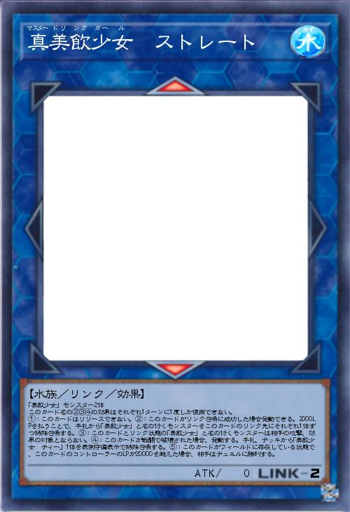 | 「美飲少女」モンスター2体 このカード名の②③④の効果はそれぞれ1ターンに1度しか使用できない。 ①:このカードはリリースできない。②:このカードがリンク召喚に成功した場合発動できる。2000LPを払うことで、手札から「美飲少女」と名の付くモンスターをこのカードのリンク先にそれぞれ1体ずつ特殊召喚する。③:このカードとリンク状態の「美飲少女」と名の付くモンスターは相手の攻撃、効果の対象とならない。④:このカードが戦闘で破壊された場合、発動する。手札、デッキから「美飲少女 ティー」1体を表側守備表示で特殊召喚する。⑤:このカードがフィールドに存在している状態で、このカードのコントローラーのLPが20000を越えた場合、相手はデュエルに勝利する。 | |||