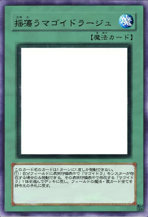 | このカード名のカードは1ターンに1度しか発動できない。 ①:自分フィールドに表側守備表示で「マゴイドラ」モンスターが存在する場合のみ発動できる。その表側守備表示で存在する「マゴイドラ」1体を選んでデッキに戻し、フィールドの魔法・罠カード全てを持ち主の手札に戻す。 | |||