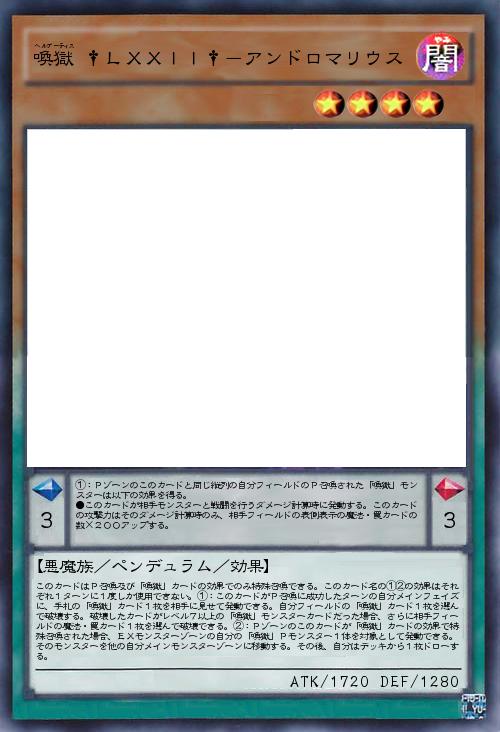 | このカードはP召喚及び「喚獄」カードの効果でのみ特殊召喚できる。このカード名の①②の効果はそれぞれ1ターンに1度しか使用できない。①:このカードがP召喚に成功したターンの自分メインフェイズに、手札の「喚獄」カード1枚を相手に見せて発動できる。自分フィールドの「喚獄」カード1枚を選んで破壊する。破壊したカードがレベル7以上の「喚獄」モンスターカードだった場合、さらに相手フィールドの魔法・罠カード1枚を選んで破壊できる。②:Pゾーンのこのカードが「喚獄」カードの効果で特殊召喚された場合、EXモンスターゾーンの自分の「喚獄」Pモンスター1体を対象として発動できる。そのモンスターを他の自分メインモンスターゾーンに移動する。その後、自分はデッキから1枚ドローする。 | |||