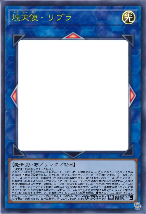 | 「煌天使」効果モンスター2体以上 このカード名の①②の効果はそれぞれ1ターンに1度しか使用できない。①:このカードのリンク召喚に成功した場合に発動できる。お互いのLPを多い方のプレイヤーのLPと同じにする。②:お互いのフィールドのモンスターの数が同じではない時に発動できる。自分はお互いのフィールドのモンスターの数が同じになるように多い方のプレイヤーのモンスターを選んで効果を無効にして破壊する。この効果の発動は無効にできず、発動後、ターン終了時まで自分はモンスターを特殊召喚できない。③:このカードがモンスターゾーンで戦闘・効果によって破壊された場合、このカードは墓地に送らずリンク魔法カード扱いで自分の魔法&罠ゾーンに置く。④:このカードが自分の魔法&罠ゾーンにリンク魔法カード扱いで存在する場合、リンク魔法カードとして以下の効果を得る。●自分の手札の枚数が相手より少なく、このカードのリンク先に | |||