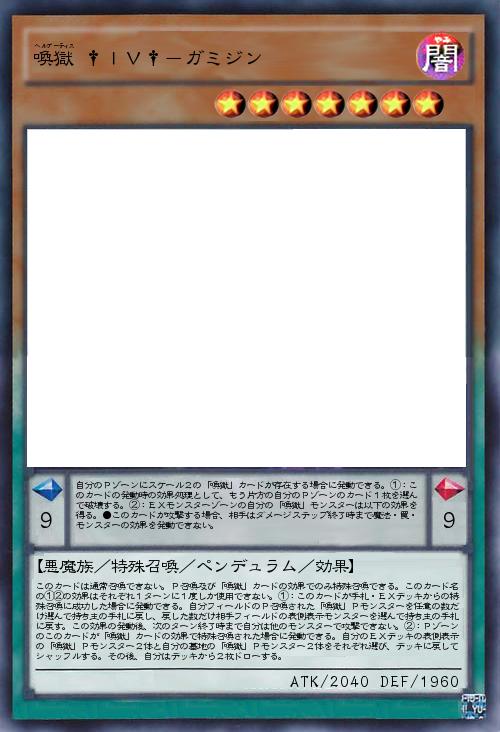 | このカードは通常召喚できない。P召喚及び「喚獄」カードの効果でのみ特殊召喚できる。このカード名の①②の効果はそれぞれ1ターンに1度しか使用できない。①:このカードが手札・EXデッキからの特殊召喚に成功した場合に発動できる。自分フィールドのP召喚された「喚獄」Pモンスターを任意の数だけ選んで持ち主の手札に戻し、戻した数だけ相手フィールドの表側表示モンスターを選んで持ち主の手札に戻す。この効果の発動後、次のターン終了時まで自分は他のモンスターで攻撃できない。②:Pゾーンのこのカードが「喚獄」カードの効果で特殊召喚された場合に発動できる。自分のEXデッキの表側表示の「喚獄」Pモンスター2体と自分の墓地の「喚獄」Pモンスター2体をそれぞれ選び、デッキに戻してシャッフルする。その後、自分はデッキから2枚ドローする。 | |||
