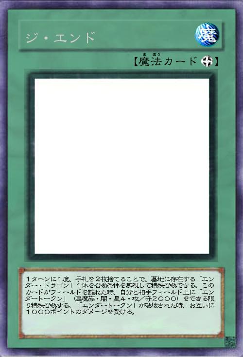 | 1ターンに1度、手札を2枚捨てることで、墓地に存在する「エンダー・ドラゴン」1体を召喚条件を無視して特殊召喚できる。このカードがフィールドを離れた時、自分と相手フィールド上に「エンダートークン」(悪魔族・闇・星4・攻/守2000)をできる限り特殊召喚する。「エンダートークン」が破壊された時、お互いに1000ポイントのダメージを受ける。 | |||