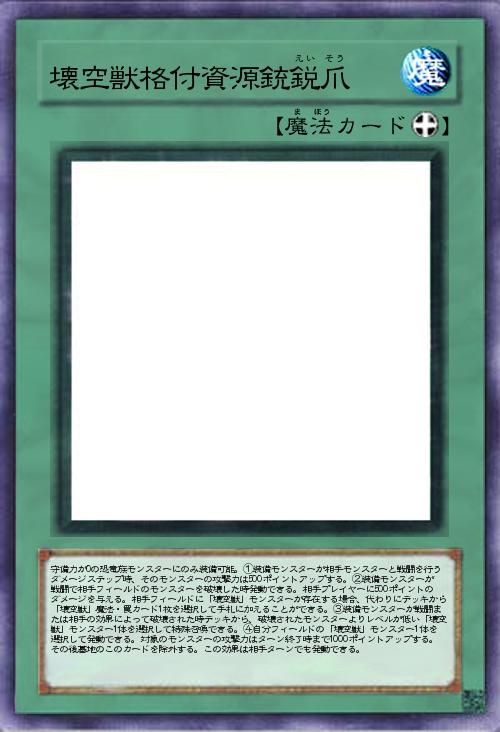| 守備力が0の恐竜族モンスターにのみ装備可能。①装備モンスターが相手モンスターと戦闘を行うダメージステップ時、そのモンスターの攻撃力は500ポイントアップする。②装備モンスターが戦闘で相手フィールドのモンスターを破壊した時発動できる。相手プレイヤーに500ポイントのダメージを与える。相手フィールドに「壊空獣」モンスターが存在する場合、代わりにデッキから「壊空獣」魔法・罠カード1枚を選択して手札に加えることができる。③装備モンスターが戦闘または相手の効果によって破壊された時デッキから、破壊されたモンスターよりレベルが低い「壊空獣」モンスター1体を選択して特殊召喚できる。④自分フィールドの「壊空獣」モンスター1体を選択して発動できる。対象のモンスターの攻撃力はターン終了時まで1000ポイントアップする。その後墓地のこのカードを除外する。この効果は相手ターンでも発動できる。 | |||