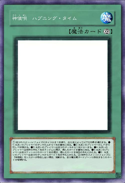 | ①:自分のスタンバイフェイズにサイコロを1回振り、出た目によって以下の効果を適応する。●1:お互いのプレイヤーのデッキの上から1枚を墓地に送る。●2:お互いのプレイヤーのLPを1000LP回復する。●3:お互いのプレイヤーは自分のデッキから1枚ドローする。●4:お互いのプレイヤーは相手の手札1枚をランダムに選び、選んだカードを墓地に送る。●5:お互いのプレイヤーは自分フィールドのカード1枚を選び、選んだカードを相手の手札に加える。●6: お互いのプレイヤーは自分のデッキからカード1枚を手札に加える。②:相手のスタンバイフェイズに「神使姫」モンスターが存在しない場合、発動する。自分魔法罠カードゾーンに存在するこのカードを破壊する。 | |||