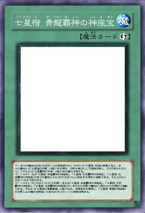| (1):自分の墓地及び自分のEXデッキの表側表示カードの中から「七星宿 天極の黄竜」1体と、自分の墓地から「七星宿の将軍 心宿」1体を選び、効果を無効にして特殊召喚し、その2体のみをリリースして手札から「七星覇神の天帝 心宿」1体を儀式召喚する。 (2):このカード及び「七星宿 朱雀覇神の神座宝」、「七星宿 玄武覇神の神座宝」、「七星宿 白虎覇神の神座宝」が自分の墓地にそれぞれ1枚ずつ以上存在する場合に発動できる。それらのカードを全て1枚ずつ除外する。 (3):このカードがこのカードの(2)の効果、または「七星宿 朱雀覇神の神座宝」、「七星宿 玄武覇神の神座宝」、「七星宿 白虎覇神の神座宝」のいずれかの効果で墓地から除外された場合に発動できる。手札から「七星宿の覚醒青龍 心宿」1体を、召喚条件を無視し、「七星宿 青龍の神座宝」の効果による儀式召喚扱いで自分メインモンスターゾー | |||