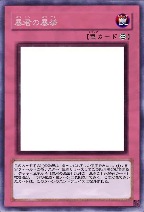 | このカード名の①の効果は1ターンに1度しか使用できない。①:自分フィールドのモンスター1体をリリースしてこの効果を発動できる。デッキ・墓地から「暴君の暴挙」以外の「暴君の」永続罠カード1枚を選び、自分の魔法・罠ゾーンに表側表示で置く。この効果で置いたカードは、このターンのエンドフェイズに除外される。 | |||