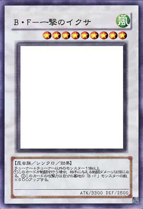 | チューナー+チューナー以外のモンスター1体以上 ①このカードが戦闘を行う場合、相手に与える戦闘ダメージは倍になる。②このカードの攻撃力は自分の墓地の「B・F」モンスターの数×500アップする。 | |||