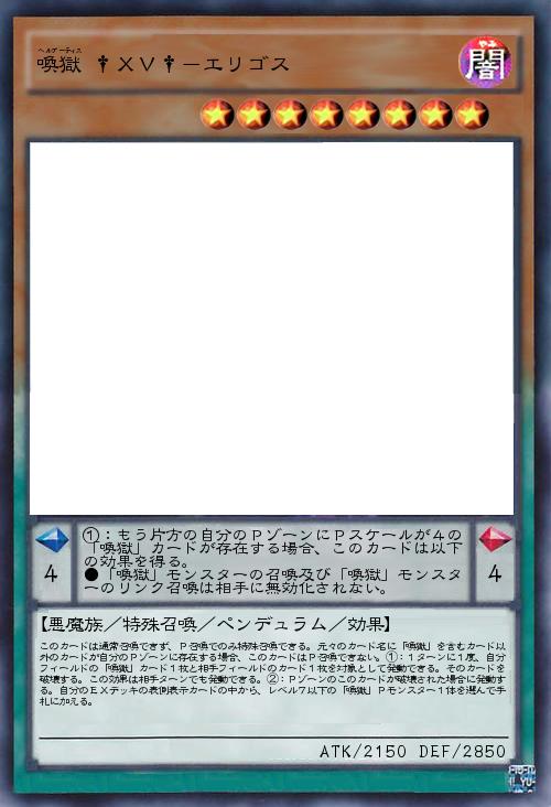 | このカードは通常召喚できず、P召喚でのみ特殊召喚できる。元々のカード名に「喚獄」を含むカード以外のカードが自分のPゾーンに存在する場合、このカードはP召喚できない。①:1ターンに1度、自分フィールドの「喚獄」カード1枚と相手フィールドのカード1枚を対象として発動できる。そのカードを破壊する。この効果は相手ターンでも発動できる。②:Pゾーンのこのカードが破壊された場合に発動する。自分のEXデッキの表側表示カードの中から、レベル7以下の「喚獄」Pモンスター1体を選んで手札に加える。 | |||