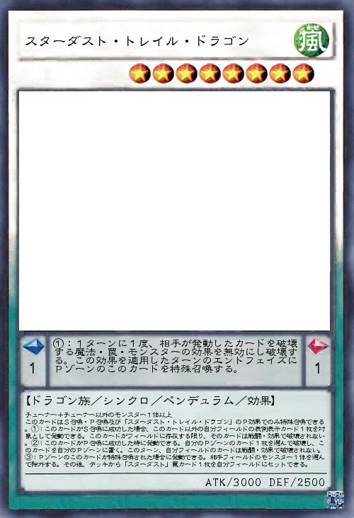| チューナー+チューナー以外のモンスター1体以上 このカードはS召喚・P召喚及び「スターダスト・トレイル・ドラゴン」のP効果でのみ特殊召喚できる。①:このカードがS召喚に成功した場合、このカード以外の自分フィールドの表側表示カード1枚を対象として発動できる。このカードがフィールドに存在する限り、そのカードは戦闘・効果で破壊されない。②:このカードがP召喚に成功した時に発動できる。自分のPゾーンのカード1枚を選んで破壊し、このカードを自分のPゾーンに置く。このターン、自分フィールドのカードは戦闘・効果で破壊されない。③:Pゾーンのこのカードが特殊召喚された場合に発動できる。相手フィールドのモンスター1体を選んで除外する。その後、デッキから「スターダスト」罠カード1枚を自分フィールドにセットできる。 | |||