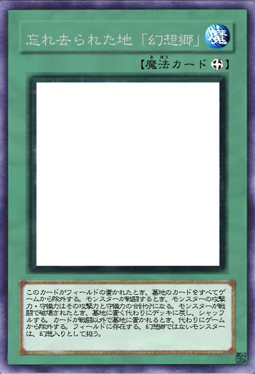 | このカードがフィールドの置かれたとき、墓地のカードをすべてゲームから除外する。モンスターが戦闘するとき、モンスターの攻撃力・守備力はその攻撃力と守備力の合計分になる。モンスターが戦闘で破壊されたとき、墓地に置く代わりにデッキに戻し、シャッフルする。カードが戦闘以外で墓地に置かれるとき、代わりにゲームから除外する。フィールドに存在する、幻想郷ではないモンスターは、幻想入りとして扱う。 | |||