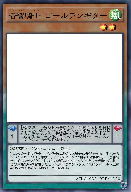 | ①このカードが召喚、特殊召喚に成功した場合に発動できる。手札からレベル4以下の「音響騎士」モンスターを1体特殊召喚する。「音響騎士 ゴールデンギター」のこの効果は1ターンに1度しか発動できず、この効果で特殊召喚したモンスターはエンドフェイズにフィールド上に表側表示で存在する場合、手札に戻る。 | |||
