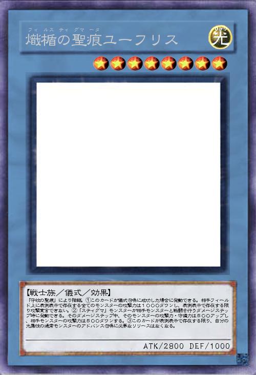 | 「守紋の聖痕」により降臨。①このカードが儀式召喚に成功した場合に発動できる。相手フィールド上に表側表示で存在する全てのモンスターの攻撃力は1000ダウンし、表側表示で存在する限り攻撃宣言できない。②「スティグマ」モンスターが相手モンスターと戦闘を行うダメージステップ時に発動できる。そのダメージステップ中、そのモンスターの攻撃力・守備力は500アップし、相手モンスターの攻撃力は500ダウンする。③このカードが表側表示で存在する限り、自分の光属性の通常モンスターのアドバンス召喚に必要なリリースはなくなる。 | |||