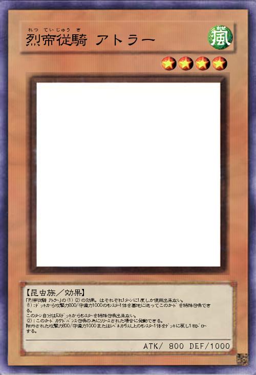 | 「烈帝従騎 アトラー」の(1)(2)の効果。はそれぞれ1ターンに1度しか使用出来ない。 (1):デッキから攻撃力800/守備力1000のモンスター1体を墓地に送ってこのカードを特殊召喚できる。 このターン自分はEXデッキからモンスターを特殊召喚出来ない。 (2):このカードがアドバンス召喚の為にリリースされた場合に発動できる。 除外された攻撃力800/守備力1000またはレベルが5以上のモンスター1体をデッキに戻し1枚ドローする。 | |||