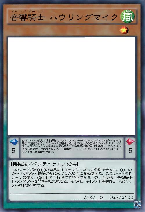 | このカード名の①②の効果は1ターンに1度しか発動できない。①このカードが召喚・特殊召喚に成功した場合に発動できる。このカードをPゾーンに置く。②手札を1枚捨てて発動できる。デッキから「音響騎士」モンスターを1体手札に加える。その後、手札の「音響騎士」モンスターを1体召喚する。 | |||