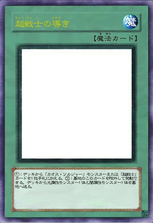 | ①:デッキから「カオス・ソルジャー」モンスターまたは「超戦士」カードを1枚手札に加える。②:墓地のこのカードを除外して発動できる。デッキから光属性モンスター1体と闇属性モンスター1体を墓地へ送る。 | |||