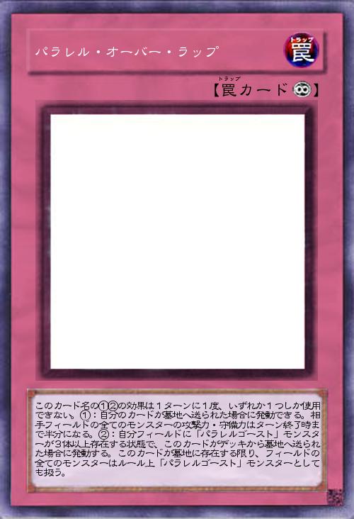 | このカード名の①②の効果は1ターンに1度、いずれか1つしか使用できない。①:自分のカードが墓地へ送られた場合に発動できる。相手フィールドの全てのモンスターの攻撃力・守備力はターン終了時まで半分になる。②:自分フィールドに「パラレルゴースト」モンスターが3体以上存在する状態で、このカードがデッキから墓地へ送られた場合に発動する。このカードが墓地に存在する限り、フィールドの全てのモンスターはルール上「パラレルゴースト」モンスターとしても扱う。 | |||