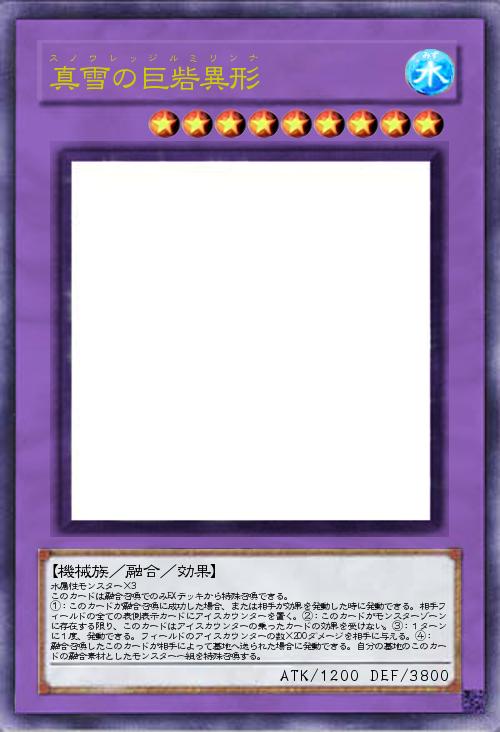 | 水属性モンスター×3 このカードは融合召喚でのみEXデッキから特殊召喚できる。 ①:このカードが融合召喚に成功した場合、または相手が効果を発動した時に発動できる。相手フィールドの全ての表側表示カードにアイスカウンターを置く。②:このカードがモンスターゾーンに存在する限り、このカードはアイスカウンターの乗ったカードの効果を受けない。③:1ターンに1度、発動できる。フィールドのアイスカウンターの数×200ダメージを相手に与える。④:融合召喚したこのカードが相手によって墓地へ送られた場合に発動できる。自分の墓地のこのカードの融合素材としたモンスター一組を特殊召喚する。 | |||