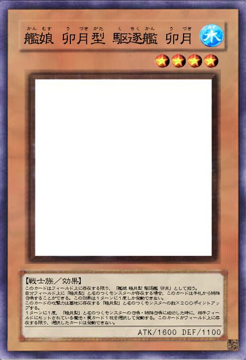 | このカードはフィールド上に存在する限り、「艦娘 睦月型 駆逐艦 卯月」として扱う。 自分フィールド上に「睦月型」と名のつくモンスターが存在する場合、このカードは手札から特殊召喚することができる。この効果は1ターンに1度しか発動できない。 このカードの攻撃力は墓地に存在する「睦月型」と名のつくモンスターの数×200ポイントアップする。 1ターンに1度、「睦月型」と名のつくモンスターの召喚・特殊召喚に成功した時に、相手フィールドにセットされている魔法・罠カード1枚を選択して発動する。このカードがフィールド上に存在する限り、選択したカードは発動できない。 | |||