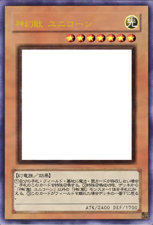| ①自分の手札・フィールド・墓地に魔法・罠カードが存在しない場合、手札のこのカードを特殊召喚する。②特殊召喚成功時、デッキから「神幻獣 ユニコーン」以外の「神幻獣」モンスター1体を手札に加える。③このカードがフィールドを離れた場合デッキの一番下に戻る。 | |||