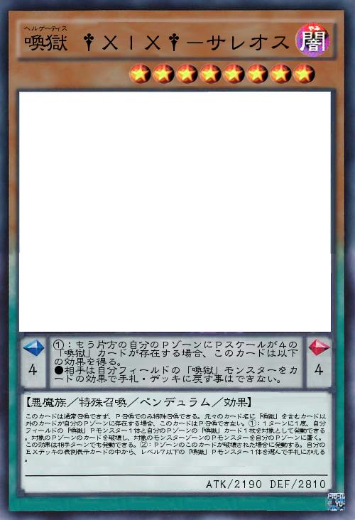 | このカードは通常召喚できず、P召喚でのみ特殊召喚できる。元々のカード名に「喚獄」を含むカード以外のカードが自分のPゾーンに存在する場合、このカードはP召喚できない。①:1ターンに1度、自分フィールドの「喚獄」Pモンスター1体と自分のPゾーンの「喚獄」カード1枚を対象として発動できる。対象のPゾーンのカードを破壊し、対象のモンスターゾーンのPモンスターを自分のPゾーンに置く。この効果は相手ターンでも発動できる。②:Pゾーンのこのカードが破壊された場合に発動する。自分のEXデッキの表側表示カードの中から、レベル7以下の「喚獄」Pモンスター1体を選んで手札に加える。 | |||