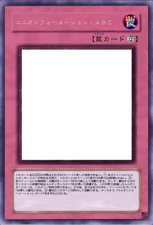 「ABCの「ユニオンフォーメーション」カード。圧縮された「ユニオン格納庫」のような効果を持ち、永続罠の遅さがありますが任意のタイミングでユニオン装備でき、ABCのユニオン効果による耐性付与を活かすことができます。