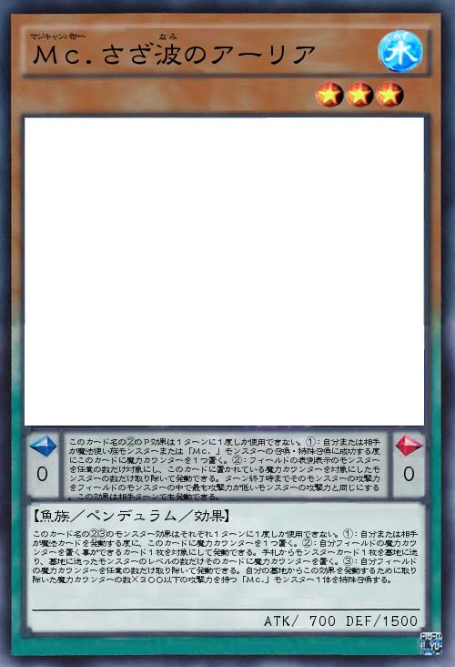 | このカード名の②③のモンスター効果はそれぞれ1ターンに1度しか使用できない。①:自分または相手が魔法カードを発動する度に、このカードに魔力カウンターを1つ置く。②:自分フィールドの魔力カウンターを置く事ができるカード1枚を対象にして発動できる。手札からモンスターカード1枚を墓地に送り、墓地に送ったモンスターのレベルの数だけそのカードに魔力カウンターを置く。③:自分フィールドの魔力カウンターを任意の数だけ取り除いて発動できる。自分の墓地からこの効果を発動するために取り除いた魔力カウンターの数×300以下の攻撃力を持つ「Mc.」モンスター1体を特殊召喚する。 | |||