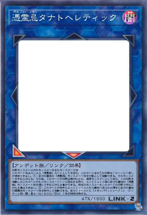 | 効果モンスター以外のモンスターを含むモンスター2体 このカード名はルール上「憑霊器」カードとしても扱う。このカード名の①の効果は1ターンに1度しか使用できない。①:自分の墓地の「憑霊魂」モンスター1体を対象として発動できる。そのモンスターを手札に加える。その後、このカードの効果は無効化され、通常モンスターとして扱う。この効果を発動したこのカードがEXモンスターゾーンに存在する限り、エンドフェイズ毎に自分の墓地の「憑霊魂」モンスター1体を選んで手札に加える事ができる。同名のモンスターをこのカードの効果で手札に加える事はできない。②:このカードが相手によってフィールドから墓地へ送られた場合に自分の墓地の闇属性モンスター1体を除外して発動できる。自分フィールドに「メモリパペットトークン」(アンデット族・闇・星4・攻1600/守0)1体を特殊召喚する。 | |||