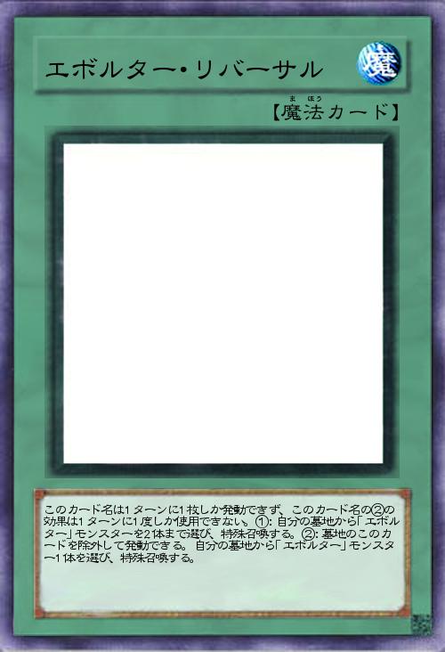 | このカード名は1ターンに1枚しか発動できず、このカード名の②の効果は1ターンに1度しか使用できない。①:自分の墓地から「エボルター」モンスターを2体まで選び、特殊召喚する。②:墓地のこのカードを除外して発動できる。自分の墓地から「エボルター」モンスター1体を選び、特殊召喚する。 | |||