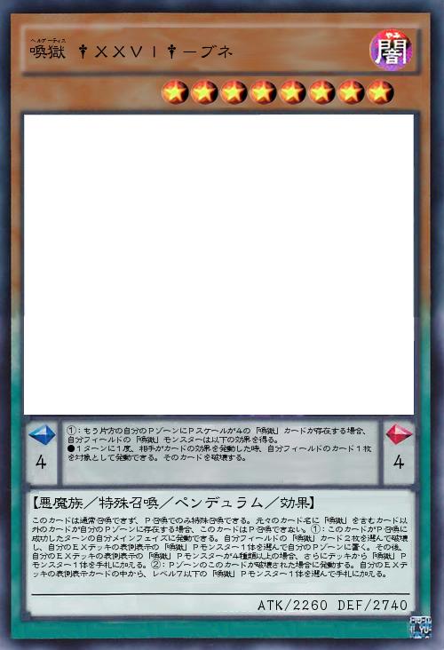 | このカードは通常召喚できず、P召喚でのみ特殊召喚できる。元々のカード名に「喚獄」を含むカード以外のカードが自分のPゾーンに存在する場合、このカードはP召喚できない。①:このカードがP召喚に成功したターンの自分メインフェイズに発動できる。自分フィールドの「喚獄」カード2枚を選んで破壊し、自分のEXデッキの表側表示の「喚獄」Pモンスター1体を選んで自分のPゾーンに置く。その後、自分のEXデッキの表側表示の「喚獄」Pモンスターが4種類以上の場合、さらにデッキから「喚獄」Pモンスター1体を手札に加える。②:Pゾーンのこのカードが破壊された場合に発動する。自分のEXデッキの表側表示カードの中から、レベル7以下の「喚獄」Pモンスター1体を選んで手札に加える。 | |||