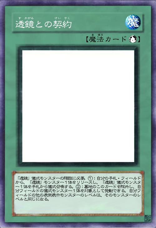 | 「透鏡」儀式モンスターの降臨に必要。①:自分の手札・フィールドから、「透鏡」モンスター1体をリリースし、「透鏡」儀式モンスター1体を手札から儀式召喚する。②:墓地のこのカードを除外し、自分フィールドの儀式モンスター1体を対象として発動できる。自分フィールドの他の表側表示モンスターのレベルは、そのモンスターのレベルと同じになる。 | |||