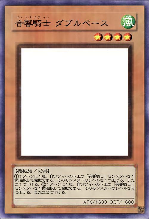 「音響騎士モンスター7体目です。音響戦士ベーシスを意識した効果になっています。こちらはチューナーではない代わりに、レベルの変化を本家よりも柔軟に行えます。ちなみに、モデルはツインネックのベースです(そんなものが存在するのかは知らないが)。」(2019-06-02 17:47)