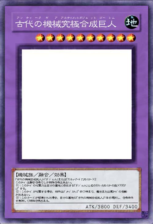 | 「古代の機械合成巨人」+「ガジェット」または「アンティーク・ギア」モンスター×2 このカードは融合召喚でしか特殊召喚出来ない。 (1):このカードの攻撃力は自分の墓地に存在する「ガジェット」と名の付いたモンスターの数×100アップする。 (2):このカードが攻撃する場合、相手はダメージステップ終了時まで、魔法または罠カードの発動が出来ない。 (3):このカードが破壊された場合、自分の墓地の「古代の機械合成巨人」1体を選択し、召喚条件を無視して特殊召喚出来る。 | |||