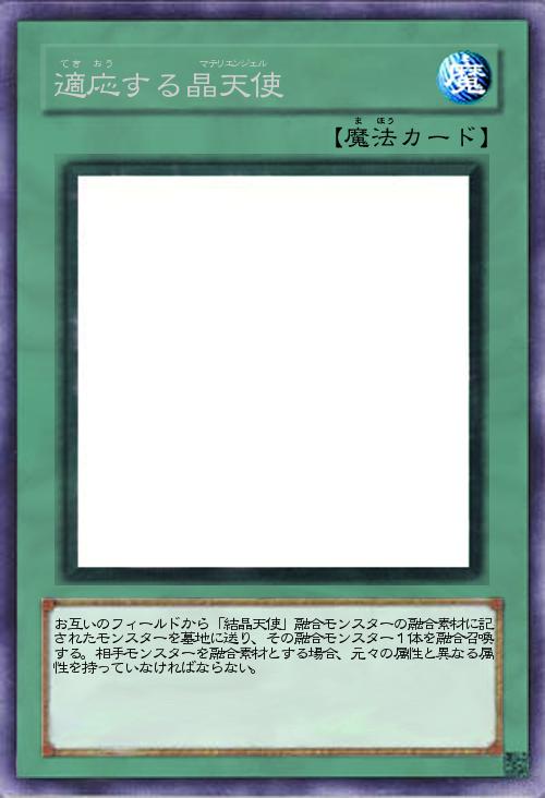 | お互いのフィールドから「結晶天使」融合モンスターの融合素材に記されたモンスターを墓地に送り、その融合モンスター1体を融合召喚する。相手モンスターを融合素材とする場合、元々の属性と異なる属性を持っていなければならない。 | |||