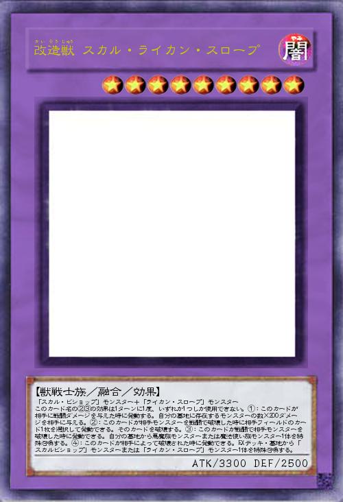 | 「スカル・ビショップ」モンスター+「ライカン・スロープ」モンスター このカード名の②③の効果は1ターンに1度、いずれか1つしか使用できない。①:このカードが相手に戦闘ダメージを与えた時に発動する。自分の墓地に存在するモンスターの数×200ダメージを相手に与える。②:このカードが相手モンスターを戦闘で破壊した時に相手フィールドのカード1枚を選択して発動できる。そのカードを破壊する。③:このカードが戦闘で相手モンスターを破壊した時に発動できる。自分の墓地から悪魔族モンスターまたは魔法使い族モンスター1体を特殊召喚する。④:このカードが相手によって破壊された時に発動できる。EXデッキ・墓地から「スカルビショップ」モンスターまたは「ライカン・スロープ」モンスター1体を特殊召喚する。 | |||
