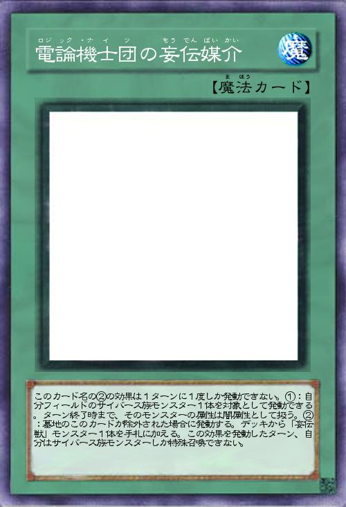 | このカード名の②の効果は1ターンに1度しか発動できない。①:自分フィールドのサイバース族モンスター1体を対象として発動できる。ターン終了時まで、そのモンスターの属性は闇属性として扱う。②:墓地のこのカードが除外された場合に発動する。デッキから「妄伝獣」モンスター1体を手札に加える。この効果を発動したターン、自分はサイバース族モンスターしか特殊召喚できない。 | |||