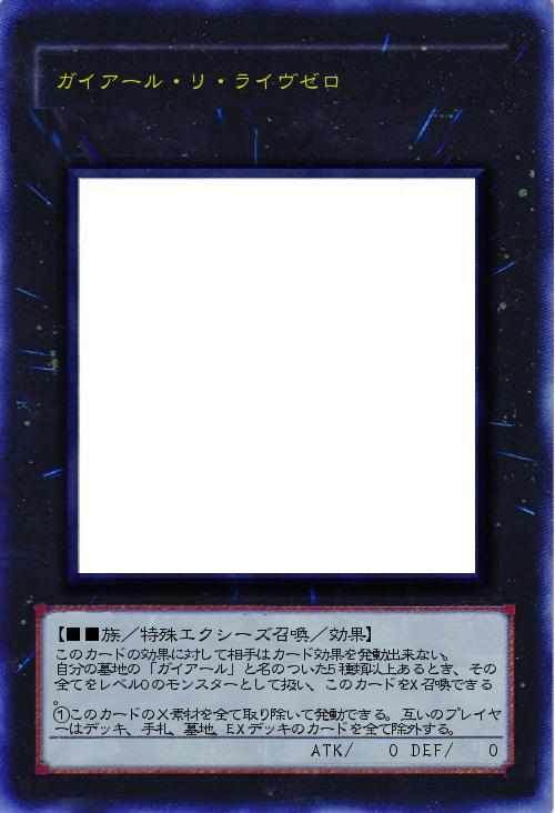 | このカードの効果に対して相手はカード効果を発動出来ない。 自分の墓地の「ガイアール」と名のついた5種類以上あるとき、その全てをレベル0のモンスターとして扱い、このカードをX召喚できる。 ①このカードのX素材を全て取り除いて発動できる。互いのプレイヤーはデッキ、手札、墓地、EXデッキのカードを全て除外する。 | |||