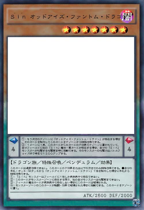 | このカードは通常召喚できない。このカードのP効果または以下の方法でのみ特殊召喚できる。●自分の手札・デッキ・EXデッキから「オッドアイズ・ファントム・ドラゴン」1体を除外した場合に手札から特殊召喚できる。 ①:「Sin」モンスターはフィールドに1体しか表側表示で存在できない。 ②:このカードがモンスターゾーンに存在する限り、他の自分モンスターは攻撃宣言できない。 ③:フィールド魔法カードが表側表示で存在しない場合にこのカードは破壊される。 ④:モンスターゾーンのこのカードが戦闘・効果で破壊された場合に発動できる。このカードをPゾーンに置く。 | |||