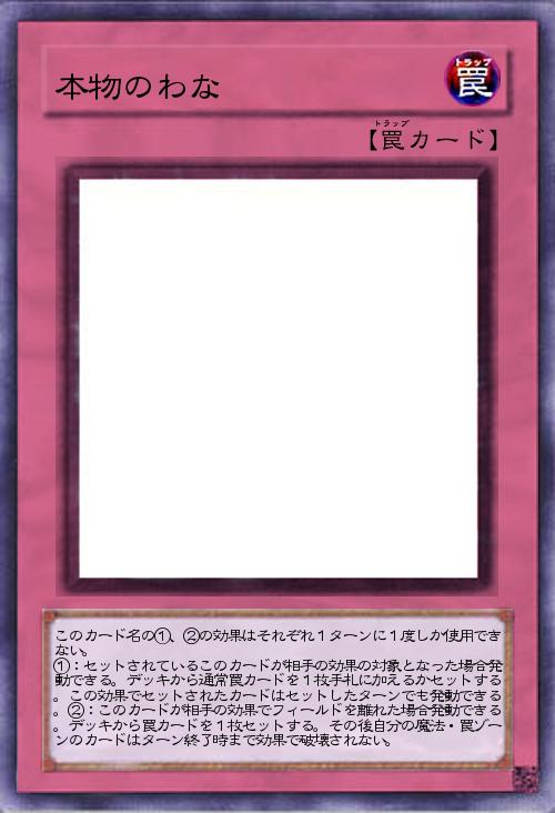 | このカード名の①、②の効果はそれぞれ1ターンに1度しか使用できない。 ①:セットされているこのカードが相手の効果の対象となった場合発動できる。デッキから通常罠カードを1枚手札に加えるかセットする。この効果でセットされたカードはセットしたターンでも発動できる。②:このカードが相手の効果でフィールドを離れた場合発動できる。デッキから罠カードを1枚セットする。その後自分の魔法・罠ゾーンのカードはターン終了時まで効果で破壊されない。 | |||