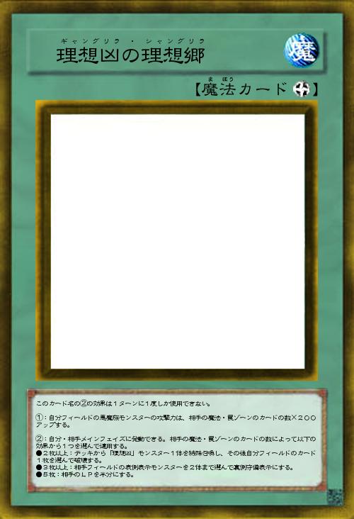 | このカード名の②の効果は1ターンに1度しか使用できない。 ①:自分フィールドの悪魔族モンスターの攻撃力は、相手の魔法・罠ゾーンのカードの数×200アップする。 ②:自分・相手メインフェイズに発動できる。相手の魔法・罠ゾーンのカードの数によって以下の効果から1つを選んで適用する。 ●2枚以上:デッキから「理想凶」モンスター1体を特殊召喚し、その後自分フィールドのカード1枚を選んで破壊する。 ●3枚以上:相手フィールドの表側表示モンスターを2体まで選んで裏側守備表示にする。 ●5枚:相手のLPを半分にする。 | |||