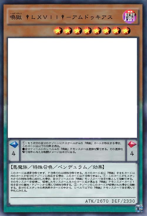 | このカードは通常召喚できず、P召喚でのみ特殊召喚できる。元々のカード名に「喚獄」を含むカード以外のカードが自分のPゾーンに存在する場合、このカードはP召喚できない。①:このカードがEXデッキからの特殊召喚に成功した場合、自分フィールドの「喚獄」モンスター1体を対象として発動できる。そのモンスターを破壊し、破壊したモンスターと元々のカード名が異なる「喚獄」Pモンスターカード1枚を自分の墓地・Pゾーンから選んで特殊召喚する。②:Pゾーンのこのカードが破壊された場合に発動する。自分のEXデッキの表側表示カードの中から、レベル7以下の「喚獄」Pモンスター1体を選んで手札に加える。 | |||