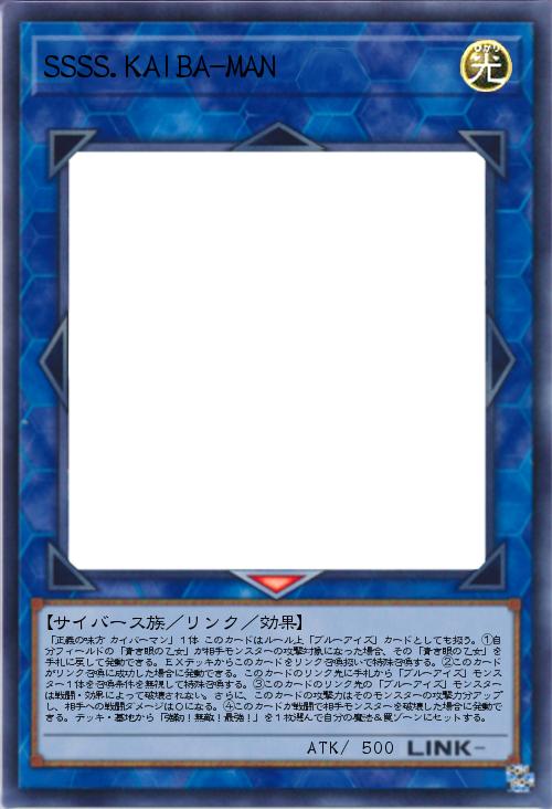 | 「正義の味方 カイバーマン」1体 このカードはルール上「ブルーアイズ」カードとしても扱う。①自分フィールドの「青き眼の乙女」が相手モンスターの攻撃対象になった場合、その「青き眼の乙女」を手札に戻して発動できる。EXデッキからこのカードをリンク召喚扱いで特殊召喚する。②このカードがリンク召喚に成功した場合に発動できる。このカードのリンク先に手札から「ブルーアイズ」モンスター1体を召喚条件を無視して特殊召喚する。③このカードのリンク先の「ブルーアイズ」モンスターは戦闘・効果によって破壊されない。さらに、このカードの攻撃力はそのモンスターの攻撃力分アップし、相手への戦闘ダメージは0になる。④このカードが戦闘で相手モンスターを破壊した場合に発動できる。デッキ・墓地から「強靭!無敵!最強!」を1枚選んで自分の魔法&罠ゾーンにセットする。 | |||