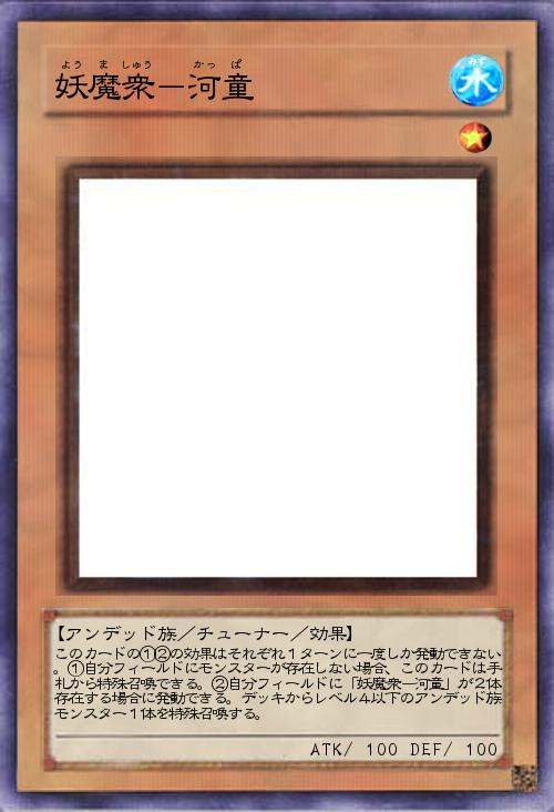 | このカードの①②の効果はそれぞれ1ターンに一度しか発動できない。①自分フィールドにモンスターが存在しない場合、このカードは手札から特殊召喚できる。②自分フィールドに「妖魔衆-河童」が2体存在する場合に発動できる。デッキからレベル4以下のアンデッド族モンスター1体を特殊召喚する。 | |||